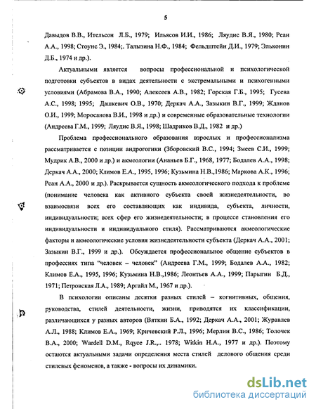 Актуальными является вопросы профессиональной и психологической подготовки субъектов в видах деятельности с экстремальными и психогенными условиями (Абрамова В.А., 1990; Алексеев А.В., 1982; Горская Г.Б., 1995; Гусева А.С., 1998; 1995; Дашкевич О.В., 1970; Деркач А.А., Зазыкин В.Г., 1999; Жданов О.И., 1999; Моросанова В.И., 1998 и др.) и современные образовательные технологии (Андреева Г.М., 1999; Ляудис В.Я., 1998; Шадриков В.Д., 1982 и др.)