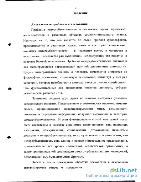 Проблема интерсубъективности в настоящее время привлекает исследователей в различных областях социогуманитарного знания. Несмотря на то, что она является по своей природе философской, проявляющейся в различных науках лишь в некоторых контекстных понятиях интерсубъективности, - в последнее время, в частности в психологии, появляется ряд публикаций, использующих это понятие в качестве базовой аксиоматики. Проблема интерсубъективности значима и для формирующейся перспективной научной дисциплины акмеологии. Будучи интегративным знанием о человеке, акмеология опирается на философию, психологию, социальную психологию, заимствуя у них ряд категорий, которые приобретают в акмеологическом знании новый смысл. Это фундаментальные для акмеологии понятия: личность, субъект, деятельность, развитие и т.д.