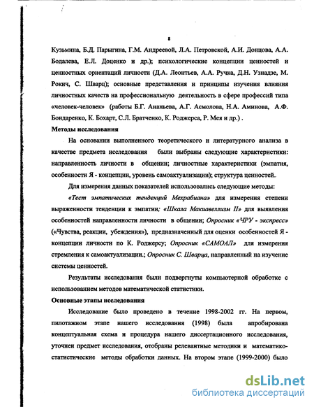 Кузьмина, Б.Д. Парыгина, Г.М. Андреевой, Л.А. Петровской, А.И. Донцова, А.А. Бодалева, Е.Л. Доценко и др.); психологические концепции ценностей и ценностных ориентации личности (Д.А. Леонтьев, А.А. Ручка, Д.Н. Узнадзе, М. Рокич, С. Шварц); основные представления и принципы изучения влияния личностных качеств на профессиональную деятельность в сфере профессий типа «человек-человек» (работы Б.Г. Ананьева, А.Г. Асмолова, Н.А. Аминова, А.Ф. Бондаренко, К. Бохарт, С.Л. Братченко, К. Роджерса, Р. Мея и др.) . Методы исследования