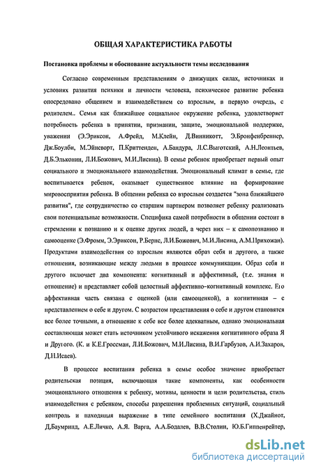 Согласно современным представлениям о движущих силах, источниках и условиях развития психики и личности человека, психическое развитие ребенка опосредовано общением и взаимодействием со взрослым, в первую очередь, с родителем.. Семья как ближайшее социальное окружение ребенка, удовлетворяет потребность ребенка в принятии, признании, защите, эмоциональной поддержке, уважении (Э.Эриксон, А.Фрейд, М.Клейн, Д.Винникотт, Э.Бронфенбреннер, Дж.Боулби, М.Эйнсворт, П.Криттенден, А.Бандура, Л.С.Выготский, А.НЛеонтьев, Д.Б.Эльконин, Л.И.Божович, М.ИЛисина). В семье ребенок приобретает первый опыт социального и эмоционального взаимодействия. Эмоциональный климат в семье, где воспитывается ребенок, оказывает существенное влияние на формирование мировосприятия ребенка. В общении ребенка со взрослым создается "зона ближайшего развития", где сотрудничество со старшим партнером позволяет ребенку реализовать свои потенциальные возможности. Специфика самой потребности в общении состоит в стремлении к познанию и к оценке других людей, а через них - к самопознанию и самооценке (Э.Фромм, Э.Эриксон, Р.Бернс, Л.И.Божович, М.ИЛисина, А.М.Прихожан). Продуктами взаимодействия со взрослым являются образ себя и другого, а также отношения, возникающие между людьми в процессе коммуникации. Образ себя и другого включает два компонента: когнитивный и аффективный, (т.е. знания и отношение) и представляет собой целостный аффективно-когнитивный комплекс. Ею аффективная часть связана с оценкой (или самооценкой), а когнитивная - с представлением о себе и другом. С возрастом представления о себе и другом становятся все более точными, а отношение к себе все более адекватным, однако эмоциональная составляющая может стать источником устойчивого искажения когнитивного образа Я и Друї ого. (К. и К.Е.Гроссман, Л.И.Божович, М.ИЛисина, В.И.Гарбузов, А.И.Захаров, Д.Н.Исаев).