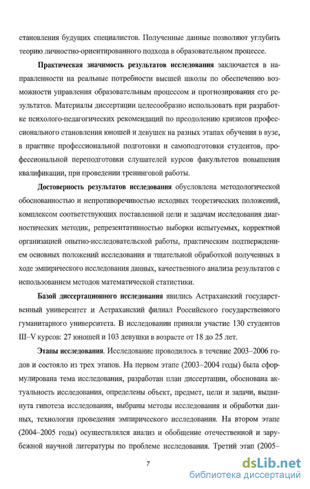 Апробация работы. Основные положения и результаты диссертационного исследования докладывались и обсуждались на международных (Москва, 2005; Астрахань, 2005); и всероссийских (Бийск, 2005; Набережные Челны, 2005) научно-теоретических и научно-практических конференциях, на заседаниях кафедры психологии, научно-методических семинарах аспирантов и ежегодных итоговых научных конференциях Астраханского государственного университета (Астрахань, 2004-2006). Материалы исследования нашли отражение в восьми опубликованных работах автора, в том числе в двух журналах, включенных в перечень изданий, утвержденных ВАК для публикации результатов диссертационных исследований.
