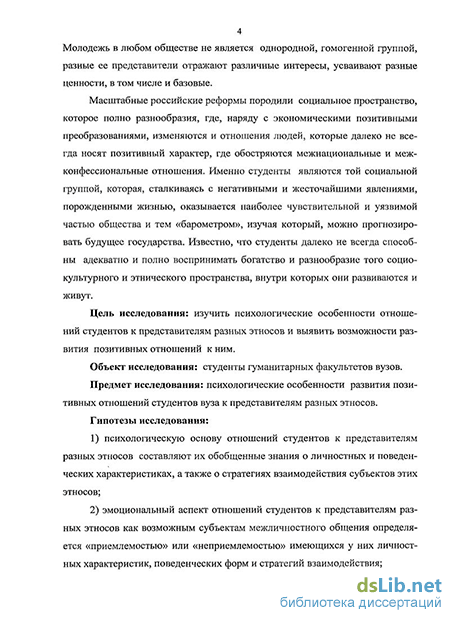 Предмет исследования: психологические особенности развития позитивных отношений студентов вуза к представителям разных этносов. Гипотезы исследования: