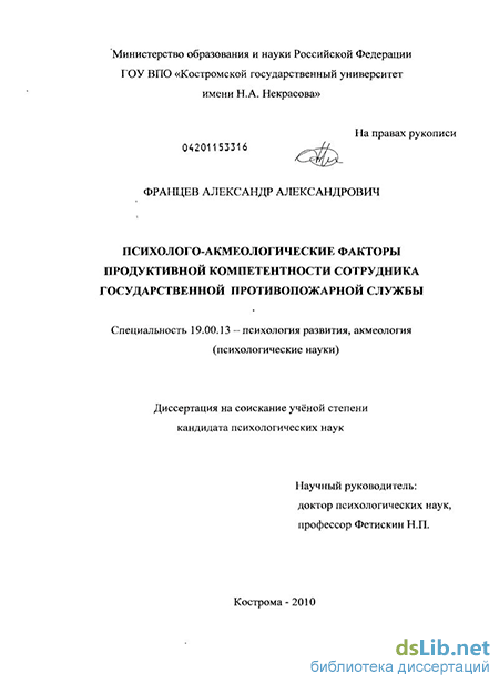 Таким образом, анализ и обобщение литературы по данной проблематике дает основание утверждать, что проблема влияния психолого-акмеологических факторов на развитие продуктивной компетентности сотрудника ГПС специально никем не изучалась, несмотря на её научно-практическую значимость.