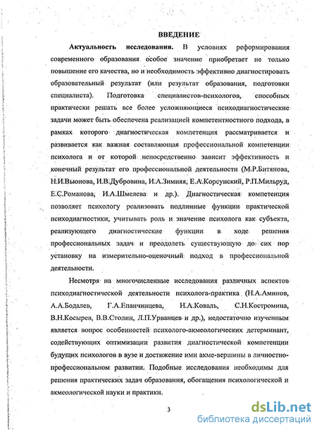 Несмотря на многочисленные исследования различных аспектов психодиагностической деятельности психолога-практика (Н.А.Аминов, А.А.Бодалев, Г.А.Епанчинцева, Н.А.Коваль, С.Н.Костромина, В.Н.Косырев, В.В.Столин, Л.П.Урванцев и др.), недостаточно изученным является вопрос особенностей психолого-акмеологических детерминант, содействующих оптимизации развития диагностической компетенции будущих психологов в вузе и достижение ими акме-вершины в личностно-профессиональном развитии. Подобные исследования необходимы для решения практических задач образования, обогащения психологической и акмеологической науки и практики.