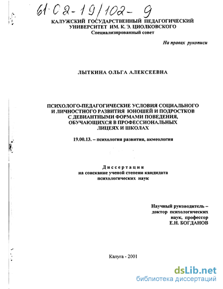 Предмет исследования - психолого-педагогические условия социального и личностного развития юношей и подростков с девиантными формами поведения.