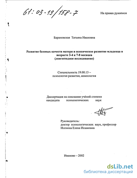Данная диссертационная работа отражает один из этапов исследования, начатого в 1990 году под руководством Е.И. Исениной (Е.И. Исенина, 1991,1995, 1996; Е.В. Попцова, 1995 и др.), посвященного изучению качеств матери, необходимых для психического развития ребенка младенческого и раннего возраста.