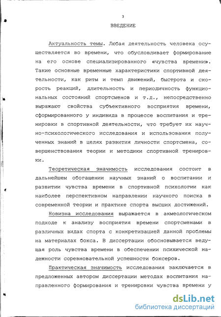 Актуальность темы. Любая деятельность человека осуществляется во времени, что обусловливает формирование на его основе специализированного «чувства времени». Такие основные временные характеристики спортивной деятельности, как ритм и темп движений, быстрота и скорость реакций, длительность и периодичность функциональных состояний спортсменов и т.д., непосредственно выражают свойства субъективного восприятия времени, сформированного у индивида в процессе воспитания и тренировки в спортивной деятельности, что требует их научно-психологического исследования и использования полученных знаний в целях развития личности спортсмена, совершенствования теории и методики спортивной тренировки.
