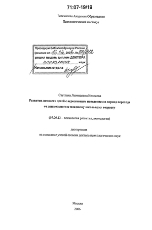 Актуальность исследования. Проблема агрессии у детей в последние годы стала одной из наиболее широко обсуждаемых, что находит отражение в многочисленных публикациях на эту тему. Однако попытки описания специфически детской агрессии остаются преимущественно эмпирическими (162, 207 и т.д.), что повышает ценность научных исследований, специально посвященных изучению проблемы психологических особенностей детей с агрессивным поведением на определенном возрастном этапе становления их личности (231). Учитывая, что именно в дошкольном возрасте происходят коренные изменения в мотивационно-потребностной сфере личности - у детей формируются такие психологические новообразования как иерархия мотивов и первичные этические инстанции, нравственная позиция, ребенок становится субъектом морального поведения (20, 236, 241, 250), становится очевидным, что возраст 6-7 лет имеет особое значение в плане изучения агрессии у детей. Однако по-прежнему не известны фундаментальные отличия процесса становления личности ребенка с агрессивным поведением на ранних этапах жизни и его закономерности, тем более это относится к развитию личности детей с агрессивным поведением в критические возрастные периоды, когда происходит повышение частоты агрессивных проявлений в поведении детей как форма протеста на социальную ситуацию развития, переставшую удовлетворять потребности формирующейся личности. В переходные периоды развития, наряду с появлением новых возможностей, возникают серьезные риски возникновения отклонений в формировании личности, в связи с чем Бреслав Г.М. отмечает, что регрессивная негативистическая позиция характерна для "аномального" кризиса и вне зависимости от того, проявляется ли она в агрессии или в пассивном уходе, прежде всего такая позиция тормозит становление социальной организации деятельности. В тех случаях, когда отсутствуют условия, необходимые для преодоления естественного на ранних этапах развития личности эгоцентризма, нарушается процесс прогрессивного функционального развития, формирования просоциальных мотивов поведения, расширяется почва для конфликтов с окружающей социальной средой (29). В этом контексте проблема развития личности детей с агрессивным поведением в период перехода от дошкольного к младшему школьному возрасту развития приобретает особую актуальность.