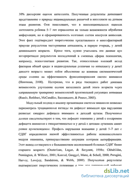 30% дисперсии оценок интеллекта. Полученные результаты дополняют представление о природе индивидуальных различий в интеллекте на данном этапе развития. Они показывают, что в конвенциональных оценках интеллекта ребенка 5-7 лет отражаются не только возможности обработки информации, но и сформированность мозговых систем контроля внимания. Этот факт подтверждает теоретические представления о многофакторной природе результатов тестирования интеллекта, в первую очередь, у детей дошкольного возраста. Кроме того, нужно учитывать эти данные при интерпретации результатов исследований в смежных сферах психологии, например, психогенетике развития. Так, относительно высокий вклад факторов общей среды в индивидуальные различия по интеллекту у детей данного возраста может найти объяснение во влиянии систематической среды именно на эффективность функционирования систем внимания (Новикова, 2008). Интересно, что в ряде последних работ доказана возможность улучшения оценок интеллекта детей этого возраста через направленную тренировку возможностей произвольной регуляции внимания (Rueda, Rothbart, McCandliss, Saccomanno, & Posner, 2005).