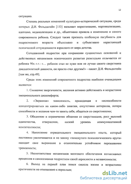 Степень реальных изменений культурно-исторической ситуации, среди которых Д.И. Фельдштеин [153] называет маркетизацию, маргинализацию, адопцию, медикализацию и др., объективно привела к изменению и самого современного ребенка. Следует также признать особенную пагубность для подросткового возраста объективно и субъективно нарастающей психической отчужденности взрослого от мира детства.