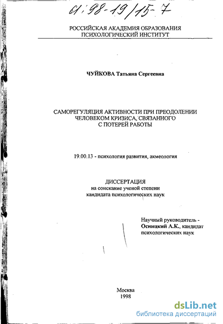 В диссертационном исследовании изучаются психологические механизмы преодоления ситуации потери работы, когда она оказывается кризисной для потерявшего работу. Такое изучение, с нашей точки зрения, позволяет рассмотреть пути активизации личностного потенциала, ресурсы которого, по нашему мнению, обеспечиваются механизмами осознанной саморегуляции активности человека. Реализация последних ведет к изменениям как в личностной, так и в деятельностной сферах. Регуляторный потенциал активности субъекта знаменателен тем, что может быть актуализирован, отрефлексирован и задействован человеком в процессе решения широкого круга задач.
