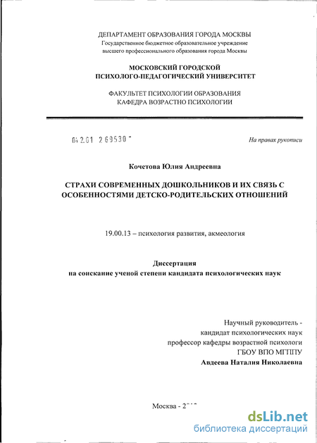 Диссертационное исследование посвящено изучению страхов современных дошкольников и их связи с особенностями детско-родительских отношений.