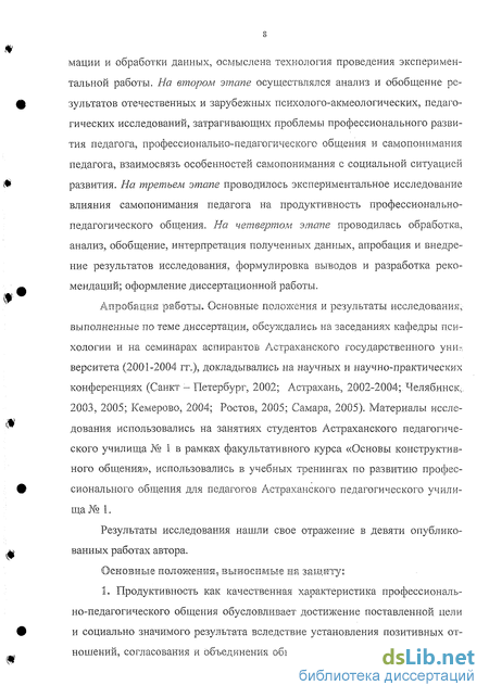 Аиробацмй работы. Основные положения и результаты исследования, выполненные по теме диссертации, обсуждались на заседаниях кафедры психологии и на семинарах аспирантов Астраханского государственного университета (2001-2004 гг.), докладывались на научных и научно-практических конференциях (Санкт - Петербург, 2002; Астрахань, 2002-2004;.Челябинск,,. 2003, 2005; Кемерово, 2004; Ростов, 2005; Самара, 2005). Материалы исследования использовались на занятиях студентов Астраханского педагогического училища № І в рамках факультативного курса «Основы конструктивного общения», использовались в учебных тренингах по развитию профессионального общения для педагогов Астраханского педагогического училища № 1.