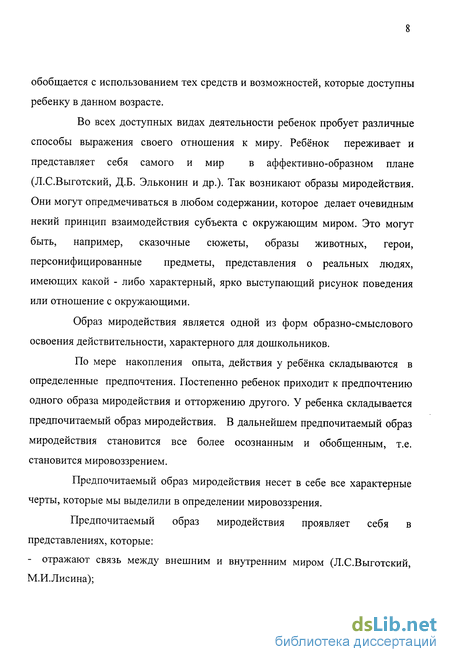 Итак, дошкольный возраст является периодом наиболее интенсивного развития предпосылок мировоззрения, когда складывается предпочитаемый образ миродействия и аффективно-образное отношение к миру, которые ложатся в фундамент мировоззрения (Л.СВыготский,