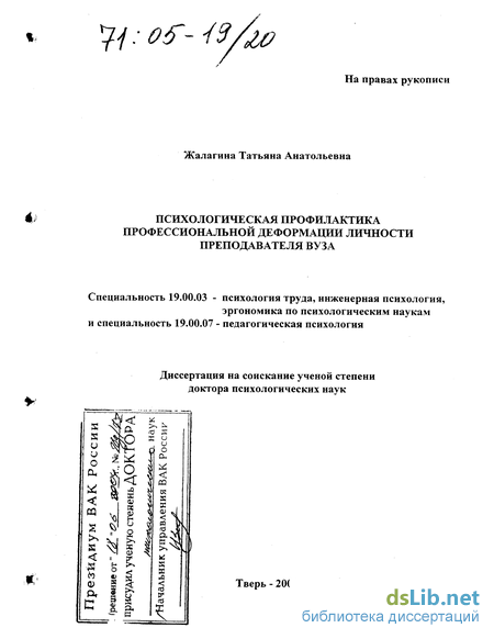 6 лагает детальную разработку различных аспектов этой социально, профессионально и личностно значимой проблемы путем использования различных процедур, мероприятий и психологических технологий. Однако в научной литературе практически отсутствуют работы, охватывающие весь спектр задач, стоящих перед исследователями рассматриваемой проблемы: от возникновения и развития, до коррекции и преодоления профессиональных деформаций личности преподавателя. Таким образом, недостаточная теоретическая разработанность (как следствие уровня методоло-го-теоретического осмысления и применяемых психологических технологий) и практическая значимость (вытекающая из увеличивающейся динамичности социально-экономической ситуации, кардинальных изменений на рынке труда, новых возможностей поиска и отбора специалистов) определяют актуальность проблемы профессиональной деформации личности преподавателя высшей школы.