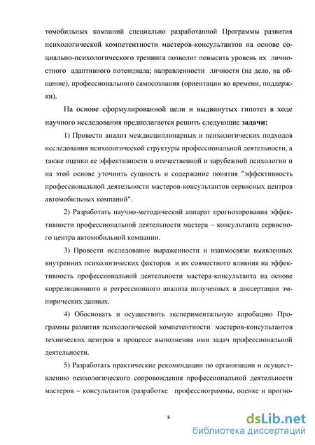 4) Обосновать и осуществить экспериментальную апробацию Программы развития психологической компетентности мастеров-консультантов технических центров в процессе выполнения ими задач профессиональной деятельности.