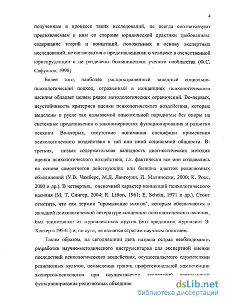 Более того, наиболее распространенный западный социально-психологический подход, отраженный в концепциях психологического насилия обладает целым рядом методологических ограничений. Во-первых, неустойчивость критериев оценки психологического воздействия, которые выделены в русле так называемой описательной парадигмы без опоры на системные представления о закономерностях функционирования и развития психики. Во-вторых, отсутствие понимания специфики применения психологического воздействия в той или иной социальной общности. В-третьих, низкая содержательная валидность диагностических методик оценки психологического воздействия, т.к. фактически все они создавались на основе самоотчетов действующих или бывших адептов религиозных объединений (У.В. Чамберс, М.Д. Лангоуни, П. Малиноски, 2000; К. Росс, 2000 и др.). В четвертых, оценочный характер концепций психологического насилия (М. Т. Сингер, 2004; R. Lifton, 1961; Е. Schein, 1971 и др.). Стоит отметить, что сам термин "промывание мозгов", которым обозначаются в западной психологической литературе концепции психологического насилия, был заимствован из журналистских кругов (его предложил журналист Э. Хантер в 1954г.) и, по сути, не является строгим научным понятием.