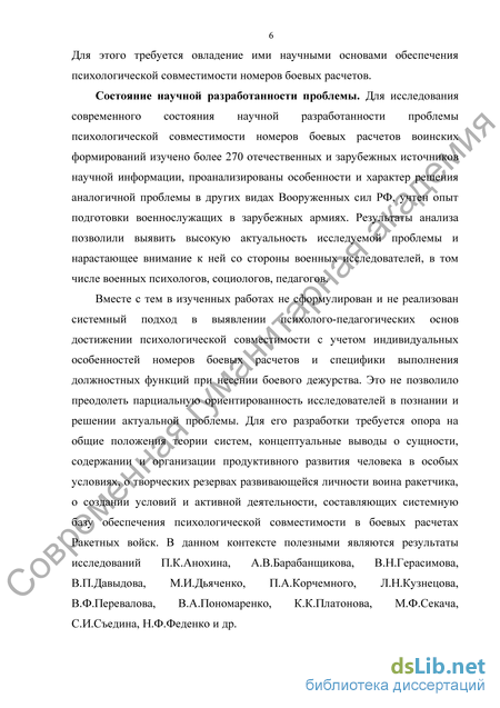 В диссертационном исследовании мы исходили из того, что психологическая совместимость, с одной стороны, выступает системным еноменом, синтезирующем в себе многие составляющие психофизиологического, социально-психологического, организационно-педагогического и иного характера. С другой стороны, психологическая совместимость номеров боевых расчетов сама выступает компонентом более сложного уровня. В частности, она определяет характер сплоченности боевого расчета, т.е. идейное, нравственное, интеллектуальное и эмоционально-волевое единство членов коллектива. В свою очередь сплоченность боевого расчета существенно влияет на особенности и характер психологической совместимости военнослужащих, что позволяет рассматривать структурные элементы сплоченности в качестве факторов, определяющих характер и уровень военнослужащих боевых расчетов. Особенно характерна тесная взаимосвязь спл психологической совместимости для небольших первичных коллективов, какими в психологической совместимости лоченност сти и воинских полной мере можно считать боевые расчеты, психологическая совместимость в которых и является объектом настоящего диссертационного исследования.