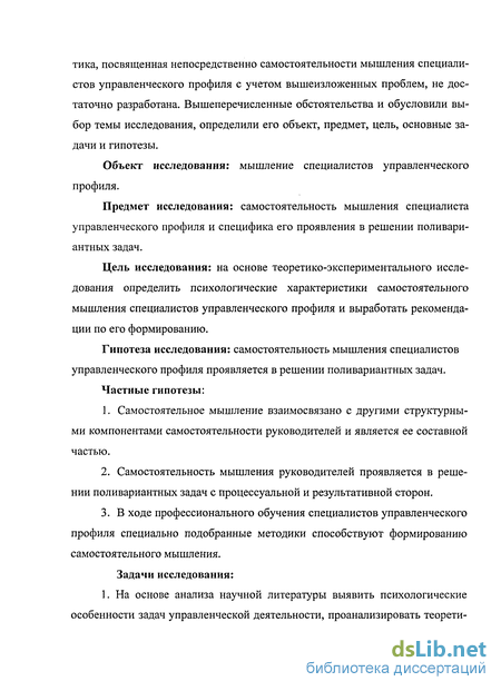 Таким образом, самостоятельность мышления и личности руководителей в научной литературе называют важнейшими качествами эффективных руководителей в силу интеллектуального характера управленческого труда, интенсивности социальных взаимодействий в совместной трудовой деятельности, варьирующей сути управления и др. Однако исследовательская тема тика, посвященная непосредственно самостоятельности мышления специалистов управленческого профиля с учетом вышеизложенных проблем, не достаточно разработана. Вышеперечисленные обстоятельства и обусловили выбор темы исследования, определили его объект, предмет, цель, основные задачи и гипотезы.