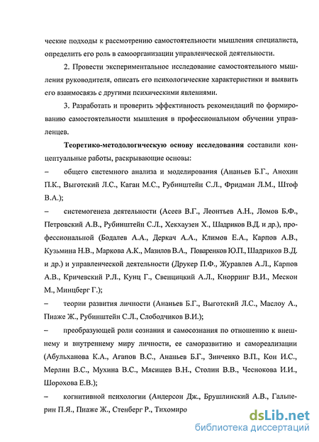 Не смотря на то, что в психологической литературе термин «самостоятельное мышление» употребляется достаточно часто, глубокого анализа данной психологической категории до сих пор не проведено, не определены его механизмы и характерные черты, не ясна его роль в решении различных по уровню сложности управленческих задач и функций. Не проводилось и специальных психологических исследований, посвященных непосредственно этому предмету. Исключением является ограниченный круг работ педагогической психологии, посвященных исследованию самостоятельности когнитивной деятельности школьников (Байрамов А.В., 1968; Осницкий А.К., 1996), студентов (Ильясов И.И., Ляудис В.Я., 1989), а также работы, имеющие косвенное отношение к самостоятельности мышления специалиста и по священные исследованию различных аспектов самоорганизации профессиональной деятельности и их взаимосвязи с ее эффективностью (Артемьева Т.И., 1988; Завалишина Д.Н., 1992; Ильин Е.П., 2000; Шадриков В.Д., 1994; Нечаев Н.Н., 1989 и др.), с процессами профессионального самоопределения и профессионализации (Бодров В.А., 1981, 1994; Климов Е.А., 1988; Кудрявцев Т.В., 1985; Маркова А.К., 1996; Поваренков Ю.П., 1989, 1991; Сухарев А.В., 1989 и др.).