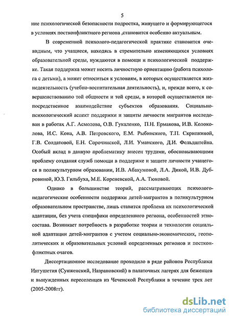 В современной психолого-педагогической практике становится очевидным, что учащиеся - беженцы, находясь в стремительно изменяющихся условиях образовательной среды, нуждаются в помощи и психологической поддержке. Такая поддержка может носить личностную ориентацию (работа психолога с детьми), а может относиться к условиям, в которых осуществляется жизнедеятельность (учебно-воспитательная деятельность), и, прежде всего, к совершенствованию той общности и той среды, в которой осуществляется непосредственное взаимодействие субъектов образования. Социально-психологический аспект поддержки и защиты личности мигрантов исследован в работах А.Г. Асмолова, О.В. Гукаленко, П.Н. Ермакова, И.В. Колоколова, И.С. Кона, А.В. Петровского, Е.М. Рыбинского, Т.П. Скрипкиной, Г.В. Солдатовой, Е.Н. Сорочинской, Л.И. Уманского, Д.И. Фельдштейна. Особый вклад в данную проблематику внесен трудами, обосновывающими проблему создания служб помощи в поддержке и защите личности учащегося в поликультурном образовании, И.В. Абакумовой, Л.А. Дикой, И.В. Дубровиной, Ю.З. Гильбуха, М.Е. Кореневской, А.А. Тюковой. Однако в большинстве теорий, рассматривающих психолого-педагогические особенности поддержки детей-мигрантов в поликультурном образовательном пространстве, лишь ставится проблема их психологической адаптации, без учета специфики определенного региона, особенностей этносостава. Возникает потребность в разработке теории и технологии социальной адаптации детей-мигрантов с учетом социально-экономических, геополитических и образовательных условий определенных регионов и постконфликтных очагов.