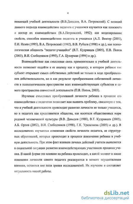 Изучение смысловых преобразований личности ребенка в процессе его взаимодействия с педагогом позволяет нам выявить проблему, связанную с тем, что в учебной деятельности происходит развитие личности не только учащихся, но и педагога как представителя общества, как носителя общественных норм родовой человеческой культуры (В.В. Давыдов (1988), В.Т. Кудрявцев (2005), А.Б. Орлов (2002), В.И. Слободчиков (1998), Г.К. Уразалиева (2005) и др.). В исследованиях изучаются изменения свойств личности педагога, ее структурных образований, которые происходят в процессе вовлечения ребенка в учебную деятельность. При этом факт влияния личных действий учителя выявляется в социальной ситуации развития взаимодействующих участников процесса учения. В какой форме это влияние на ребенка происходит, в какой момент и какие изменения личности самого педагога реализуются в момент осуществления влияния, остаются вне поля зрения исследователей. Их изучение и составляет актуальность нашей работы.