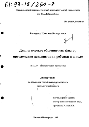 В современной педагогической психологии проблема дезадаптации изучалась сама по себе, так же, как и проблема уровней и форм педагогического общения. Мы попытались соединить эти два глобальных направления, так как считаем, что именно построение учебно-воспитательного процесса на принципах диалогического общения является одним из самых эффективных средств преодоления школьной дезадаптации ребенка.