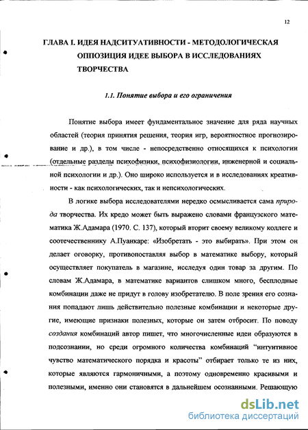 ГЛАВА I. ИДЕЯ НАДСИТУАТИВНОСТИ - МЕТОДОЛОГИЧЕСКАЯ ОППОЗИЦИЯ ИДЕЕ ВЫБОРА В ИССЛЕДОВАНИЯХ ТВОРЧЕСТВА 12