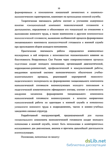 Теоретическая значимость работы состоит в уточнении содержания понятия «эмоциональный компонент психологической готовности к деятельности», определении и обосновании его показателей по отношению к выполнению воинского труда, а также взаимосвязи с другими компонентами психологической готовности; выявлении особенностей процесса формирования эмоционального компонента психологической готовности к военной службе при прохождении сборов молодого пополнения.