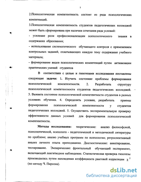 Методы исследования: теоретические: анализ философской, психологической, психолого - педагогической и методической литературы по проблеме; анализ учебных программ по психологии; ретроспективный анализ личного опыта преподавания. Диагностические: анкетирование, тестирование. Эмпирические: фронтальный обучающий эксперимент, включающий лонгитюдное наблюдение. Статистическая проверка гипотезы производилась путем нахождения коэффициента ранговой корреляции % 2 (по методу Ч. Пирсона).