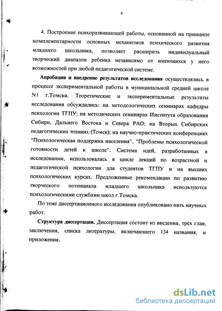 Апробация и внедрение результатов исследования осуществлялись в процессе экспериментальной работы в муниципальной средней школе N1 г.Томска. Теоретические и экспериментальные результаты исследования обсуждались: на методологических семинарах кафедры психологии ТГХТУ; на методических семинарах Института образования Сибири, Дальнего Востока и Севера РАО; на Вторых Сибирских педагогических чтениях (Томск); на научно-практических конференциях "Психологическая поддержка населения", "Проблемы психологической готовности детей к школе". Система идей, разработанных в исследовании, использовалась в цикле лекций по возрастной и педагогической психологии для студентов ТГПУ и на высших психологических курсах. Предложенные рекомендации по развитию творческого потенциала младшего школьника используются психологическими службами школ г.Томска.
