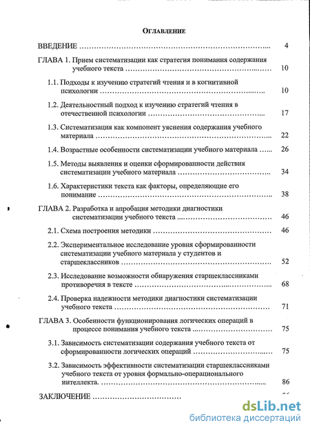 Решению первой задачи посвящена первая глава, в которой рассматриваются основные подходы к изучению стратегий чтения и понимания учебных текстов в когнитивной психологии. Описывается деятельностный подход к изучению учебных действий в отечественной психологии. Раскрывается понятие систематизации текста как компонента уяснения содержания учебного материала. Описываются возрастные особенности использования приема, анализируются возможные методы диагностики данного действия, дается обзор литературы, в котором выделяются характеристики текста, влияющие на понимание.