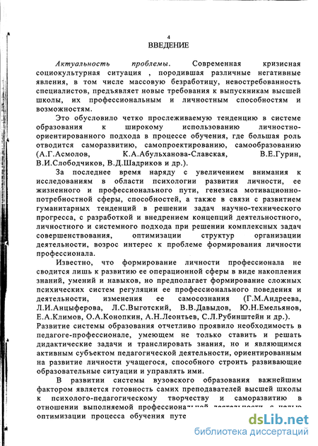 Известно, что формирование личности профессионала не сводится лишь к развитию ее операционной сферы в виде накопления знаний, умений и навыков, но предполагает формирование сложных психических систем регуляции ее профессионального поведения и деятельности, изменения ее самосознания (Г.М.Андреева, Л.И.Анцыферова, Л.С.Выготский, В.В.Давыдов, Ю.Н.Емельянов, Е.А.Климов, О.А.Конопкин, А.Н.Леонтьев, С.Л.Рубинштейн и др.). Развитие системы образования отчетливо проявило необходимость в педагоге-профессионале, умеющем не только ставить и решать дидактические задачи и транслировать знания, но и являющимся активным субъектом педагогической деятельности, ориентированным на развитие личности учащегося, способного строить развивающие образовательные ситуации и управлять ими.