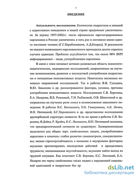 Актуальность исследования. Количество подростков и юношей с аддиктивным поведением в нашей стране продолжает увеличиваться. За период 1997-2002гг. число официально зарегистрированных наркоманов в России увеличилось в пять раз и составило около одного миллиона человек (Г.С.Барабанщиков, А.Д.Конрад). В реальности на каждого выявленного наркозависимого приходится десять скрытых случаев аддикции. Проблема усугубляется тем, что около 98% ВИЧ инфицированных - люди, употребляющие наркотики.