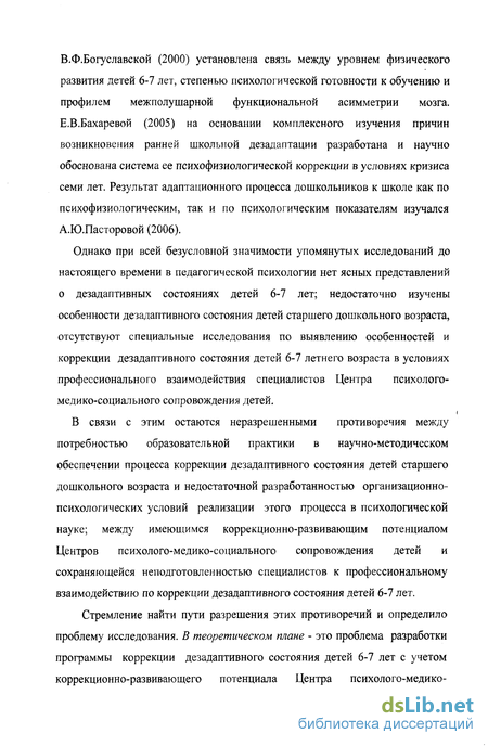 Однако при всей безусловной значимости упомянутых исследований до настоящего времени в педагогической психологии нет ясных представлений о дезадаптивных состояниях детей 6-7 лет; недостаточно изучены особенности дезадаптивного состояния детей старшего дошкольного возраста, отсутствуют специальные исследования по выявлению особенностей и коррекции дезадаптивного состояния детей 6-7 летнего возраста в условиях профессионального взаимодействия специалистов Центра психолого-медико-социального сопровождения детей.