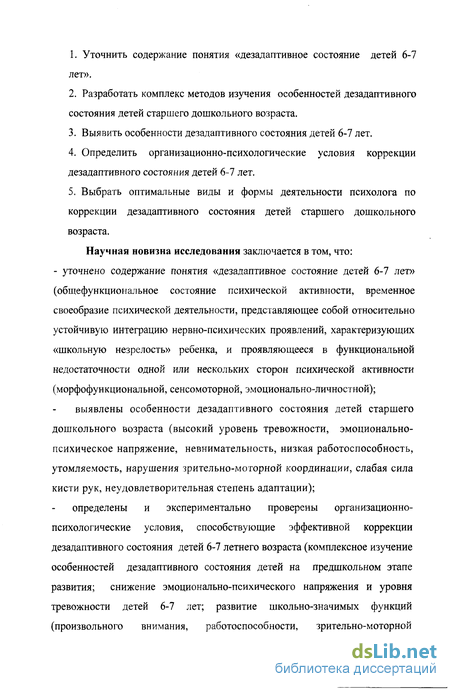Научная новизна исследования заключается в том, что: - уточнено содержание понятия «дезадаптивное состояние детей 6-7 лет» (общефункциональное состояние психической активности, временное своеобразие психической деятельности, представляющее собой относительно устойчивую интеграцию нервно-психических проявлений, характеризующих «школьную незрелость» ребенка, и проявляющееся в функциональной недостаточности одной или нескольких сторон психической активности (морфофункциональной, сенсомоторной, эмоционально-личностной);