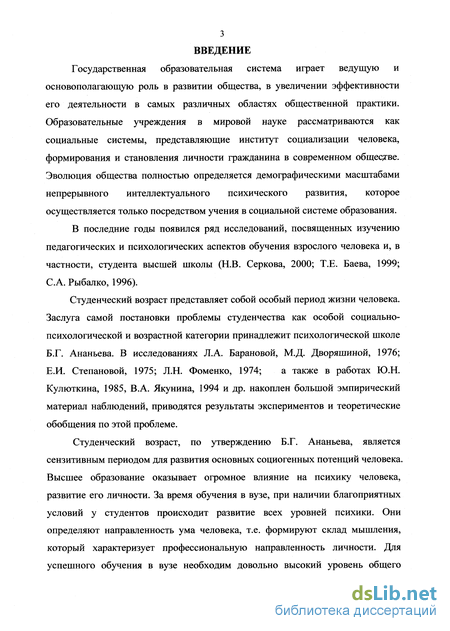 Студенческий возраст представляет собой особый период жизни человека. Заслуга самой постановки проблемы студенчества как особой социально-психологической и возрастной категории принадлежит психологической школе Б.Г. Ананьева. В исследованиях Л.А. Барановой, М.Д. Дворяшиной, 1976; Е.И. Степановой, 1975; Л.Н. Фоменко, 1974; а также в работах Ю.Н. Кулюткина, 1985, В.А. Якунина, 1994 и др. накоплен большой эмпирический материал наблюдений, приводятся результаты экспериментов и теоретические обобщения по этой проблеме.