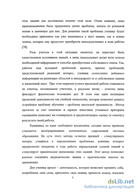 С этой точки зрения серьезный интерес представляют деятельностные технологии обучения, в частности, проектная деятельность. Отличительной особенностью этой технологии является позиция ученика. Из объекта педагогических воздействий ученик превращается в активного и заинтересованного субъекта собственного образования и развития. Технологии, подобные «методу проектов», незаменимы для выработки умений взаимодействовать с миром в себе и вокруг себя (Гузеев В.В., 1996). Проектная деятельность, позволяющая ученику быть активным субъектом, своей работы от замысла до итога — это его действий с целью решения значимой для него , оформленной в виде некоего конечного . Основное предназначение этого метода состоит в предоставлении учащемуся возможности самостоятельного приобретения знаний в процессе решения практических задач ( Е. С., Бухаркина М. Ю., Моисеева М. В., Петров А. Е., 2005).