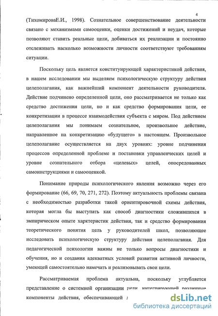 Понимание природы психологического явления возможно через его формирование (66, 69, 70, 271, 272). Поэтому актуальность проблемы связана с необходимостью разработки такой ориентировочной схемы действия, которая могла бы выступать как способ диагностики сложившихся в эмпирическом опыте харктеристик действия, так и средство формирования теоретического понятия цель у руководителей школ, позволяющее исследовать психологическую структуру действия целеполагания. Для педагогической психологии важны не только вопросы диагностики и обучения, но и создания адекватных условий развития активной личности, умеющей самостоятельно намечать и реализовывать свои цели.