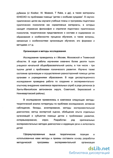 В исследовании применялись в комплексе следующие методы: теоретический анализ литературы по проблеме исследования, активное наблюдение, беседы, анкетирование, методы экспериментальной диагностики, метод экспертной оценки, обобщение опыта отдельных организаций и субъектов помощи детям с проблемами развития, интервьюирование, опрос. Разработан ряд оригинальных экспериментальных методик диагностики и коррекции речи и интеллекта детей