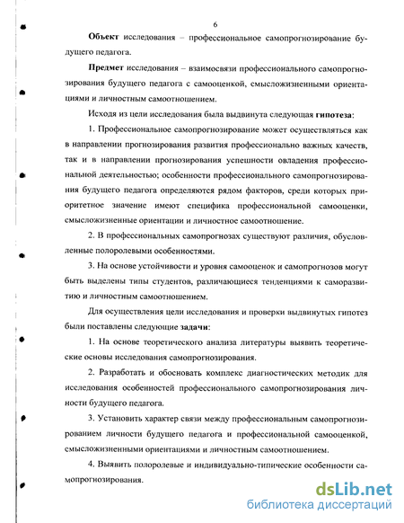 Предмет исследования - взаимосвязи профессионального самопрогнозирования будущего педагога с самооценкой, смысложизненными ориента-циями и личностным самоотношением.