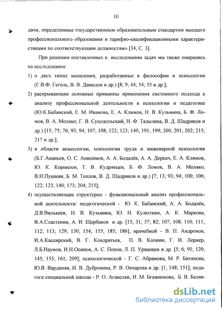 осуществляющие структурно - функциональный анализ профессиональной деятельности: педагогической - Ю. К. Бабанский, А. А. Бодалёв, Д.В.Вилькеев, Н. В. Кузьмина, Ю. Н. Кулюткин, А. К. Маркова, В.А.Сластенин, А. И. Щербаков и др. [15; 31; 37; 82; 107; 108; ПО; 111; 112; 113; 129; 130; 154; 155; 185; 186]; врачебной - В. П. Андронов, И.А.Кассирский, В. Г. Кондратьев, П. В. Копнин, Г. И. Лернер, Л.Б.Наумов, И.Н.Осипов, А. С. Попов, Л. П. Урванцев и др. [5; 6; 91; 120; 145; 153; 161; 209]; психологической - Г. С. Абрамова, М. Р. Битянова, Ю.В. Варданян, И. В. Дубровина, Р. В. Овчарова и др. [1; 148; 151]; педагога специальной школы - Р. О. Агавелян, И. М. Бгажнокова, Б. В. Беляв-