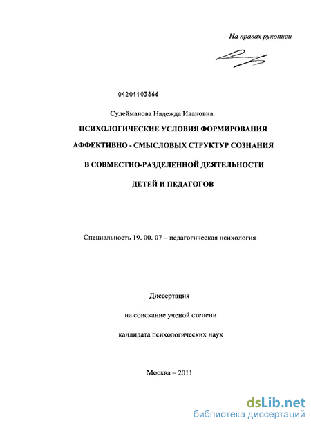 Актуальность проблемы определила тему исследования: «Психологические условия формирования аффективно-смысловых структур сознания в совместно-разделенной деятельности детей и педагогов».