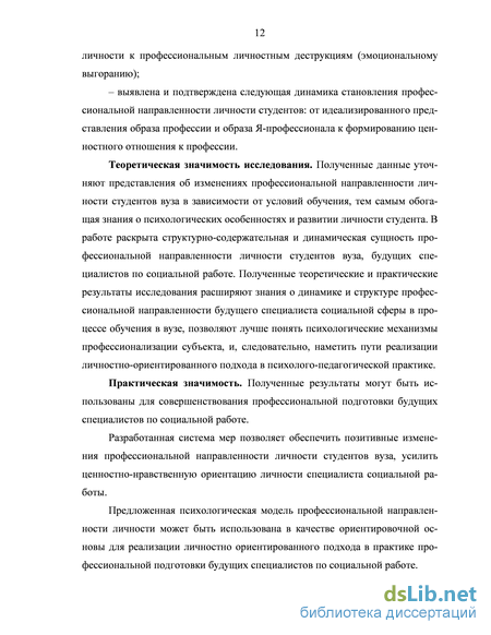 Теоретическая значимость исследования. Полученные данные уточняют представления об изменениях профессиональной направленности личности студентов вуза в зависимости от условий обучения, тем самым обогащая знания о психологических особенностях и развитии личности студента. В работе раскрыта структурно-содержательная и динамическая сущность профессиональной направленности личности студентов вуза, будущих специалистов по социальной работе. Полученные теоретические и практические результаты исследования расширяют знания о динамике и структуре профессиональной направленности будущего специалиста социальной сферы в процессе обучения в вузе, позволяют лучше понять психологические механизмы профессионализации субъекта, и, следовательно, наметить пути реализации личностно-ориентированного подхода в психолого-педагогической практике.