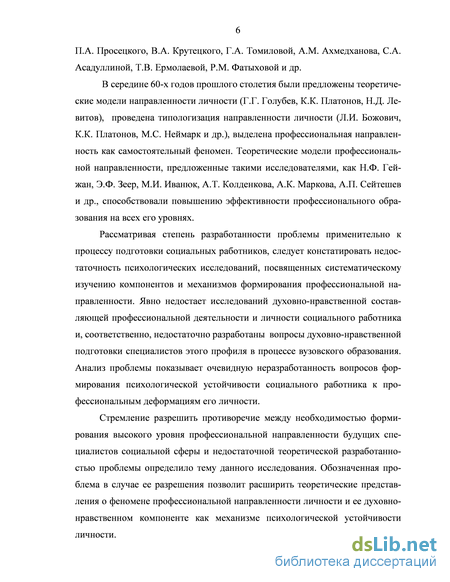 Рассматривая степень разработанности проблемы применительно к процессу подготовки социальных работников, следует констатировать недостаточность психологических исследований, посвященных систематическому изучению компонентов и механизмов формирования профессиональной направленности. Явно недостает исследований духовно-нравственной составляющей профессиональной деятельности и личности социального работника и, соответственно, недостаточно разработаны вопросы духовно-нравственной подготовки специалистов этого профиля в процессе вузовского образования. Анализ проблемы показывает очевидную неразработанность вопросов формирования психологической устойчивости социального работника к профессиональным деформациям его личности.