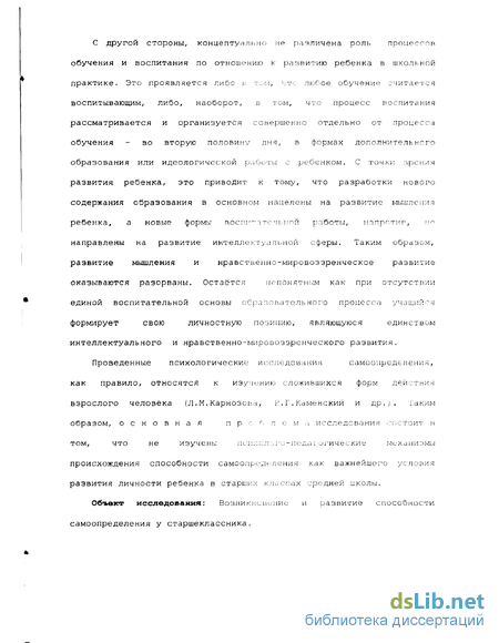 Проведенные психологические исследования самоопределения, как правило, относятся к изучению сложившихся форм действия взрослого человека (Л.М.Карнозова, Р.Г.Каменский и др.). Таким образ ом , основная п р с. f ; п о м а исследования состоит н том, что не изучены пспхслогс-педаї огические механизмы происхождения способности самоопределения как важнейшего условия развития личности ребенка в старших классах средней школы.