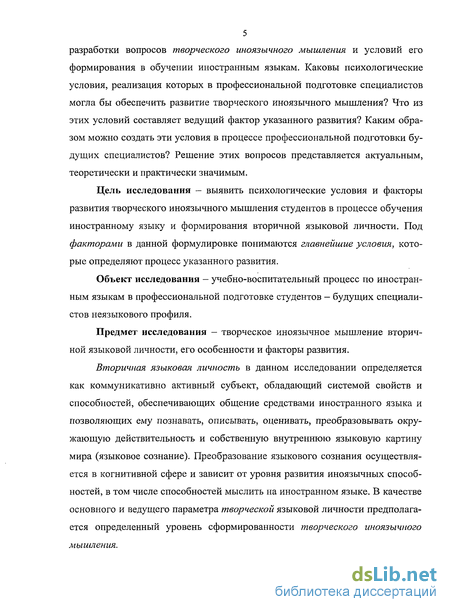 5 разработки вопросов творческого иноязычного мышления и условий его формирования в обучении иностранным языкам. Каковы психологические условия, реализация которых в профессиональной подготовке специалистов могла бы обеспечить развитие творческого иноязычного мышления? Что из этих условий составляет ведущий фактор указанного развития? Каким образом можно создать эти условия в процессе профессиональной подготовки будущих специалистов? Решение этих вопросов представляется актуальным, теоретически и практически значимым.