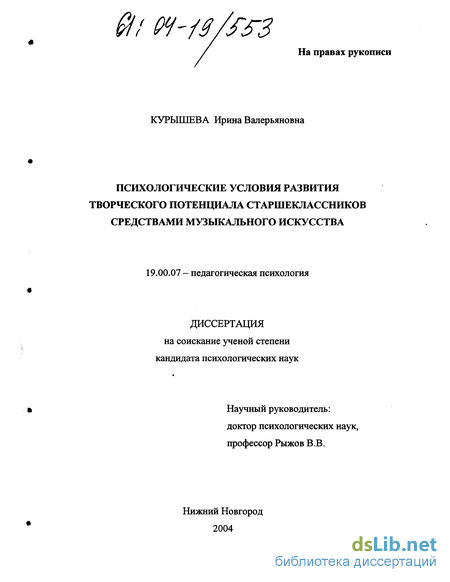 Данная диссертационная работа посвящена теоретико-экспериментальному изучению психологических условий и разработке программы целенаправленного развития творческого потенциала школьников средствами музыкального искусства. Исследование потребовало обращения к понятию творческого потенциала и его психологической структуры, к исследованию музыкальности и выявлению корреляций между ними. Учитывая, что развитие му-