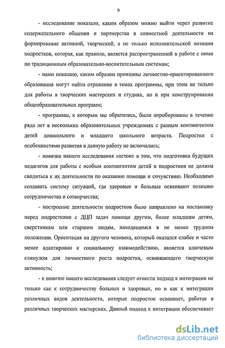 к новизне нашего исследования следует отнести подход к интеграции не только как к сотрудничеству больных и здоровых, но и как к интеграции различных видов деятельности, которые подросток осваивает, работая в различных творческих мастерских. Данный подход к интеграции обеспечивает