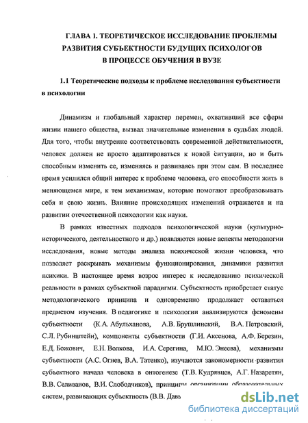 В современной науке разработаны ценные теоретические положения, на которых базируется понимание субъектности (С.Л. Рубинштейн, К.А. Абульханова, А.В. Брушлинский, Б.Г. Ананьев, В.А. Петровский, А.К. Осницкий, В.И. Слободчиков, Е.И. Исаев, О.А. Конопкин, А.С. Огнев, Е.Д. Божович, В.В. Селиванов, В.А. Татенко и др.). В настоящее время